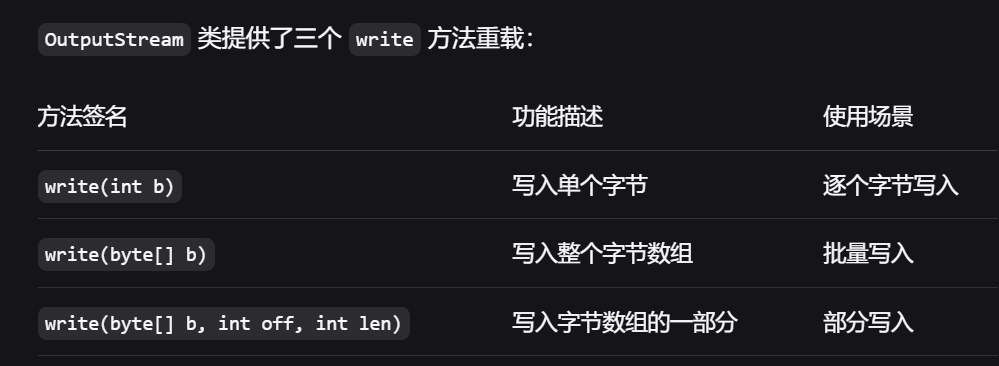 Java中的字节输出流 OutputStream 是所有输出字节流的抽象基类。它定义了写入字节数据的基本方法。具体实现类如FileOutputStream