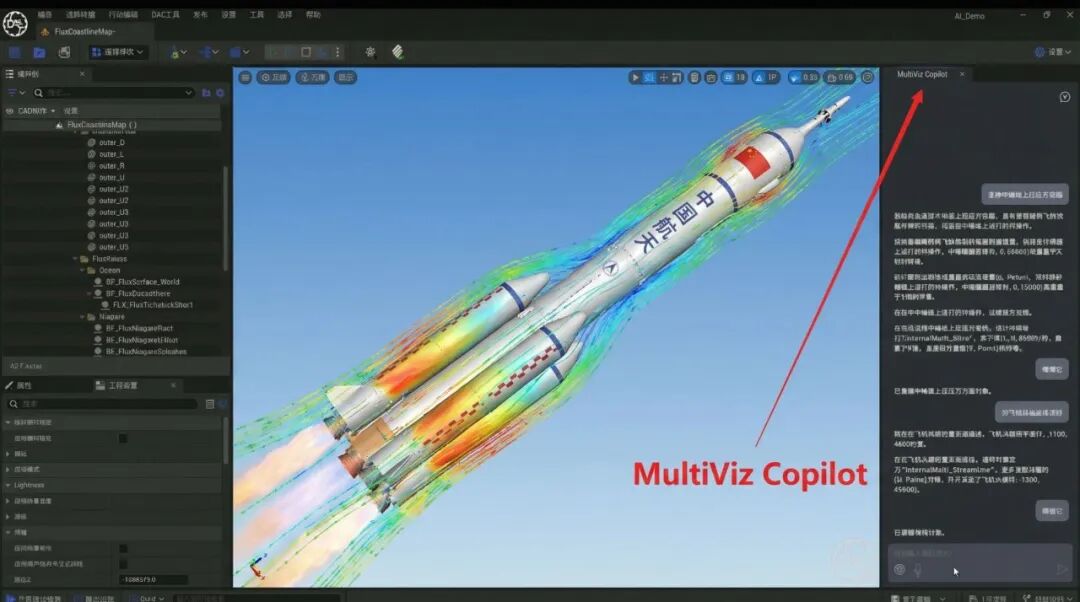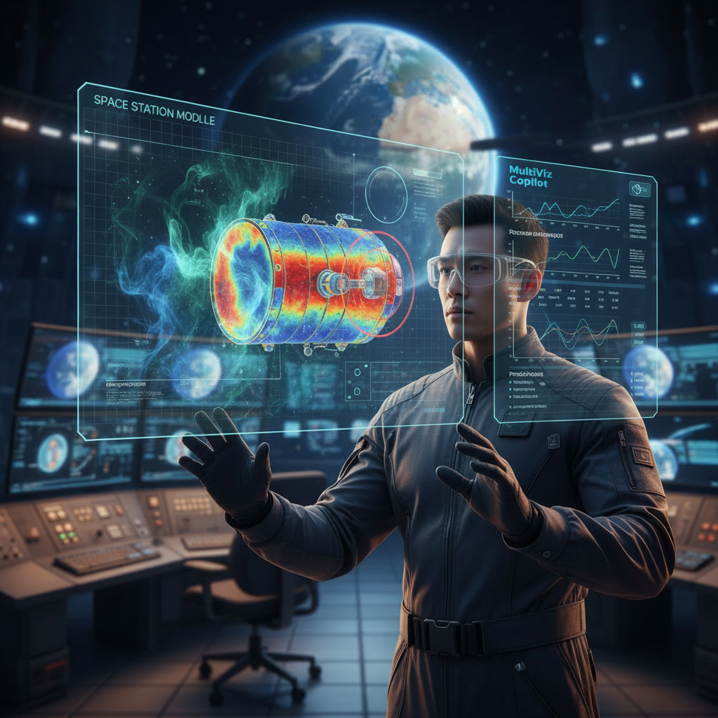 在未来的航天飞行控制中心,佩戴AR眼镜的地面专家正注视着一台悬浮于空中的虚拟节点舱。得益于MakeReal3D强大的扩展现实能力,MultiViz解析出的氧气浓度梯度、舱壁热流密度等关键生命指标被实时叠加在全息影像之上。当发现某处阀门存在异常压力波动时,AI助手MultiViz Copilot会立刻介入,它深度融合了航天器系统知识库,专家只需询问------"对比历史发射任务中同类阀门的压力曲线,评估当前泄漏风险",MultiViz Copilot便能秒级响应,自动调取历史数据、生成对比报表,并主动提示排故预案。这种人机共融的智能交互,让复杂的航天系统问题在"所见即所得"中迅速收敛,为中国航天员探索更深远的宇宙保驾护航。