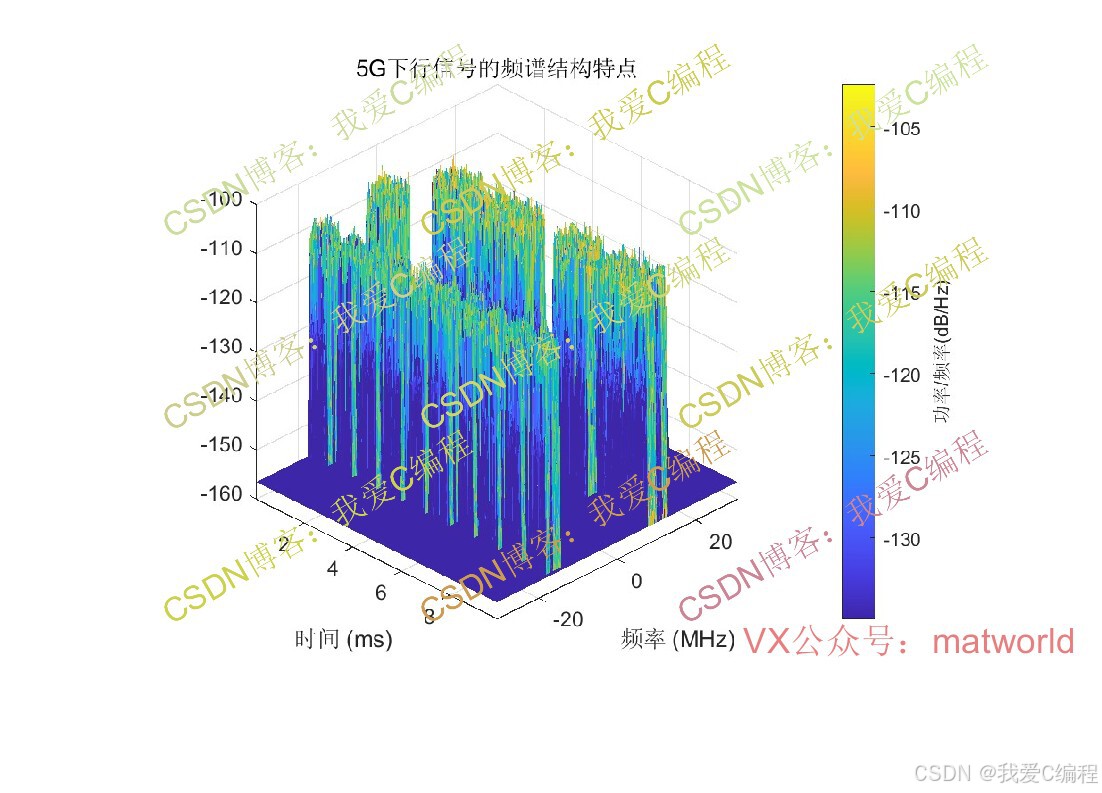 通过spectrogram函数绘制时频谱,呈现5G下行信号频谱的核心特征: