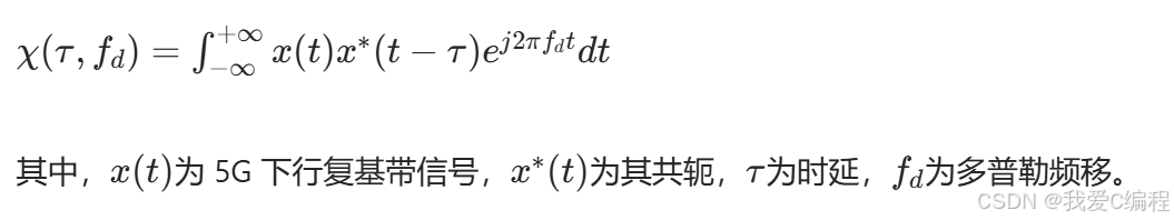 对于5G下行信号,其模糊函数反映了信号对多径时延(对应距离)和多普勒频移(对应移动速度)的分辨能力,核心定义为:信号自身在不同时延τ和多普勒频移fd下的互相关值。5G下行信号为周期性OFDM信号,其模糊函数具有二维栅格特性,同时因正交调制和伪随机序列(PN9)扰码,具备较好的时延和多普勒分辨能力。