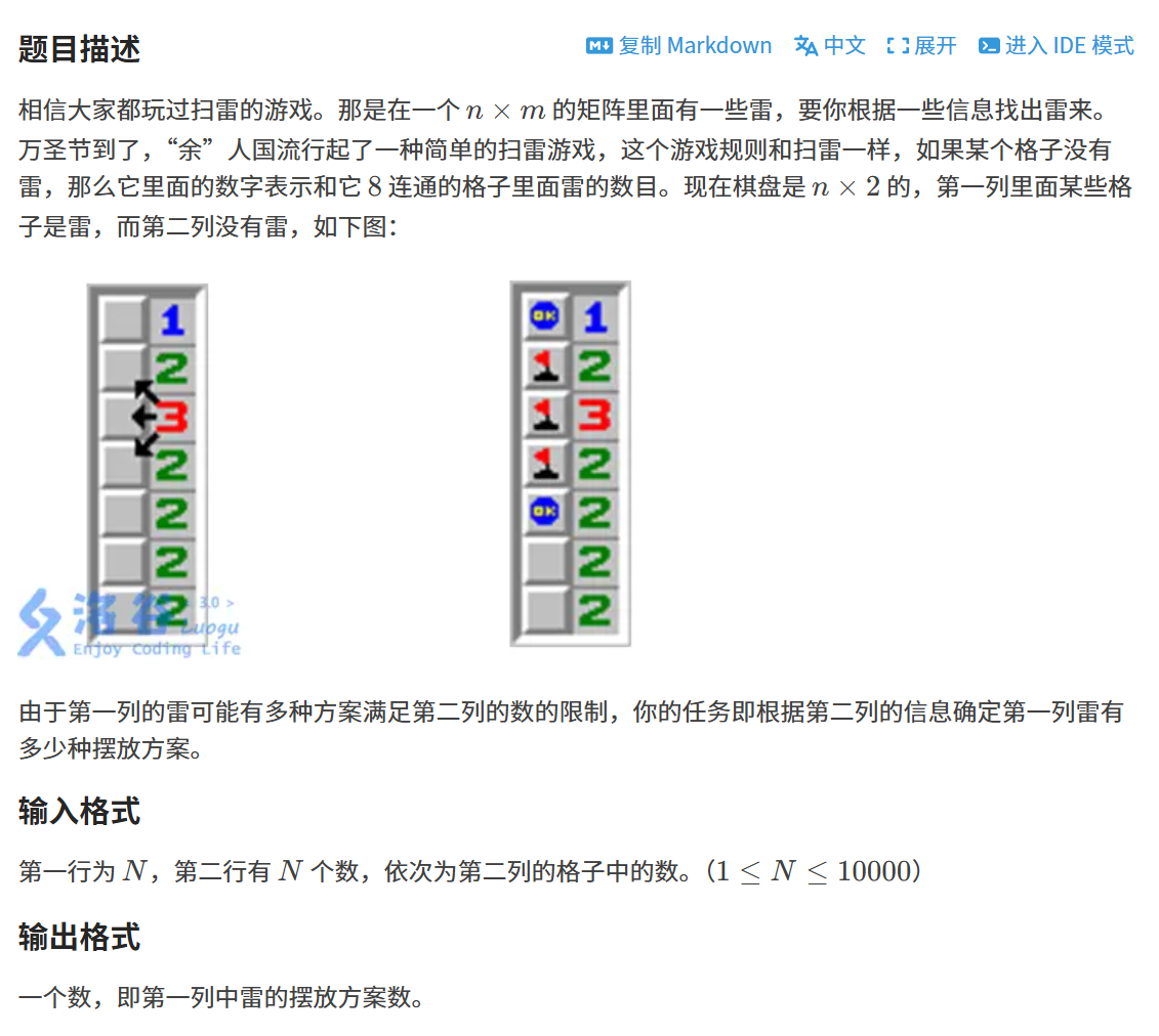 本题通过枚举雷的初始状态(有雷/无雷),从而递推出雷的分布,同时检验雷的合法性。