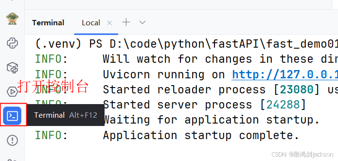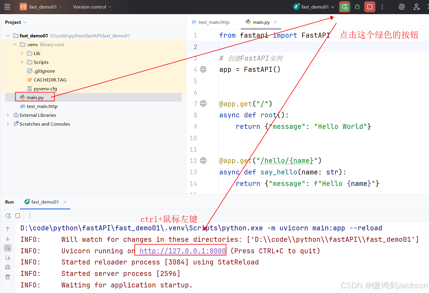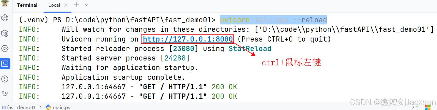 uvicorn:ASGI 服务器,用于运行fastAPI项目main:Python 文件main.py,固定写法app:文件内的 FastAPI/ASGI 应用实例名--reload:开发模式,说白了就是热部署,修改代码后无需重启项目即可更新