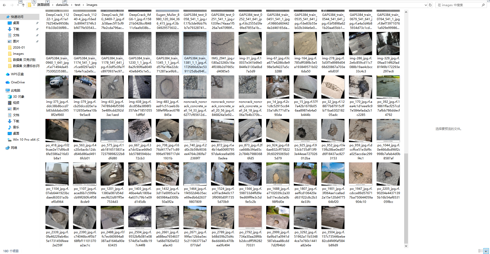 本次实验采用自建路面缺陷识别数据集,样本均来源于实际道路巡检场景,覆盖沥青、水泥等不同路面类型,包含各类常见路面缺陷,所有样本均完成标准化标注,标注格式适配 YOLO 系列模型训练要求,保障数据有效性。为保证模型训练效果与评估客观性,将数据集按合理比例划分为训练集、验证集与测试集,其中训练集 1254 张,主要用于模型参数拟合与特征学习;验证集 358 张,用于训练过程中超参数调优、模型性能监控与过拟合抑制;测试集 180 张,全程不参与训练,仅用于模型最终性能客观评估,各数据集样本分布均匀,有效避免类别不平衡问题。