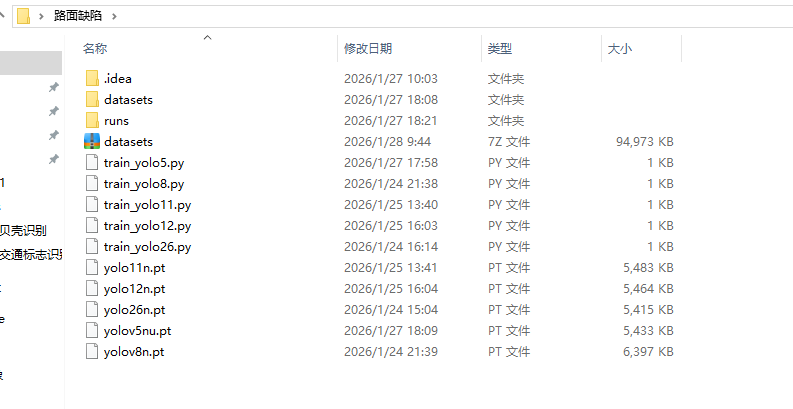 路面裂缝、坑槽、松散等常见缺陷的及时识别,是道路养护工作的核心环节,直接关系到道路通行安全与养护效率。传统人工检测方式不仅耗时耗力、主观性强,还难以适应大规模道路巡检的实际需求。随着深度学习目标检测技术的发展,YOLO 系列模型凭借端到端检测、速度快、精度高的优势,成为路面缺陷识别的优选方案。为探究不同版本 YOLO 模型在路面缺陷检测任务中的适配性,本次实验基于自建路面缺陷识别数据集,完成 YOLOv5、YOLOv8、YOLOv11、YOLOv12、YOLOv26 多版本模型的训练与性能对比,为路面缺陷识别的工程落地提供实际的模型选型参考。