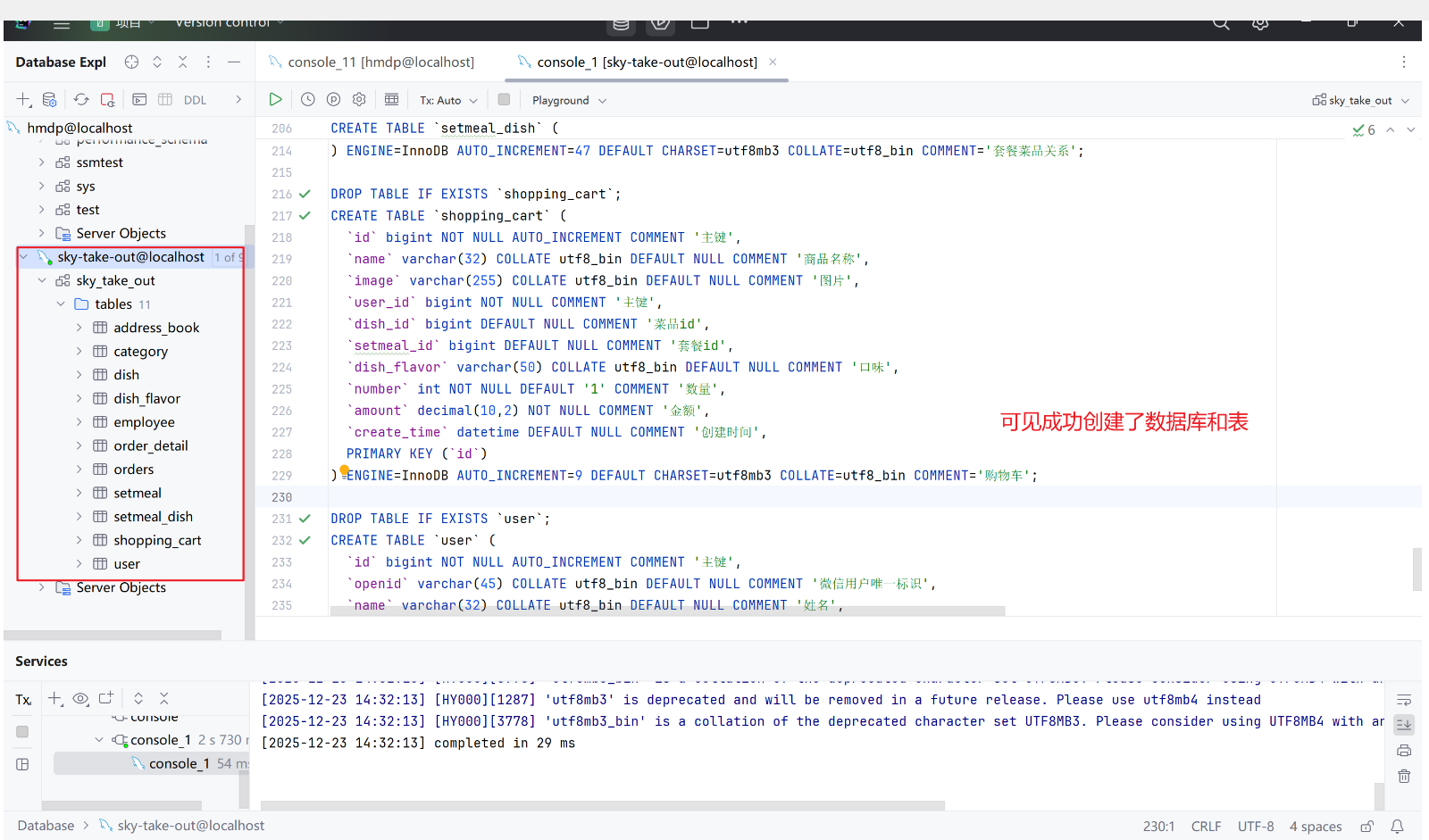 通过资料提供的数据库的创建脚本创建表即可,由于我的mysql也是通过docker进行容器搭建的,所以在创建表的前提是将你的mysql容器启动,之后就可以通过类似datagrip等图形化界面进行简化的管理和操作