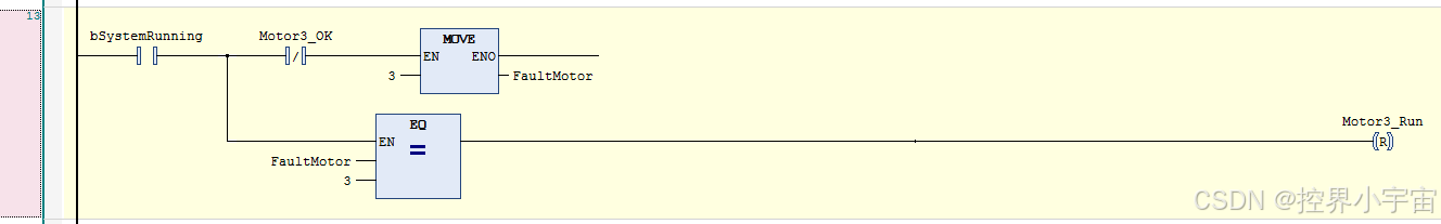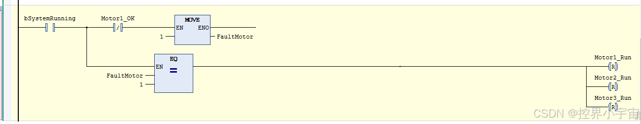 - 连锁停止:FaultMotor=1(检测到M1故障)时,同时复位Motor1_Run、Motor2_Run、Motor3_Run,停止所有电机。