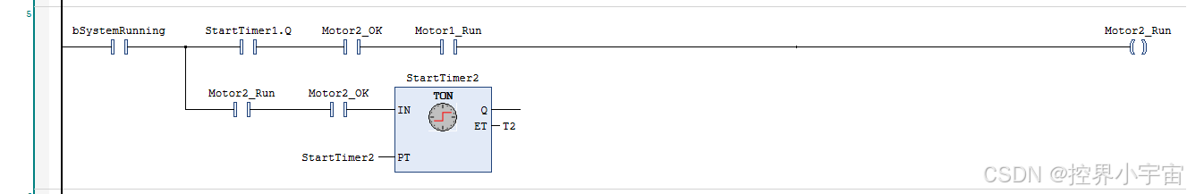 - 电机2启动:满足上述条件后,Motor2_Run=TRUE(M2接触器吸合,电机启动);