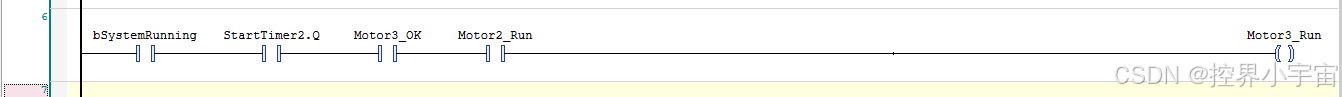 - 启动条件(AND关系):StartTimer2.Q=TRUE(M2启动延时完成)、Motor3_OK=TRUE(M3无故障)、Motor2_Run=TRUE(M2仍在正常运行);
