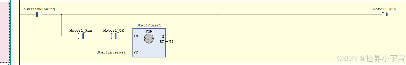 - 定时器触发:Motor1_Run=TRUE且Motor1_OK=TRUE(M1正常运行)时,启动定时器StartTimer1,开始计时(计时时间=StartInterval,默认5秒)。