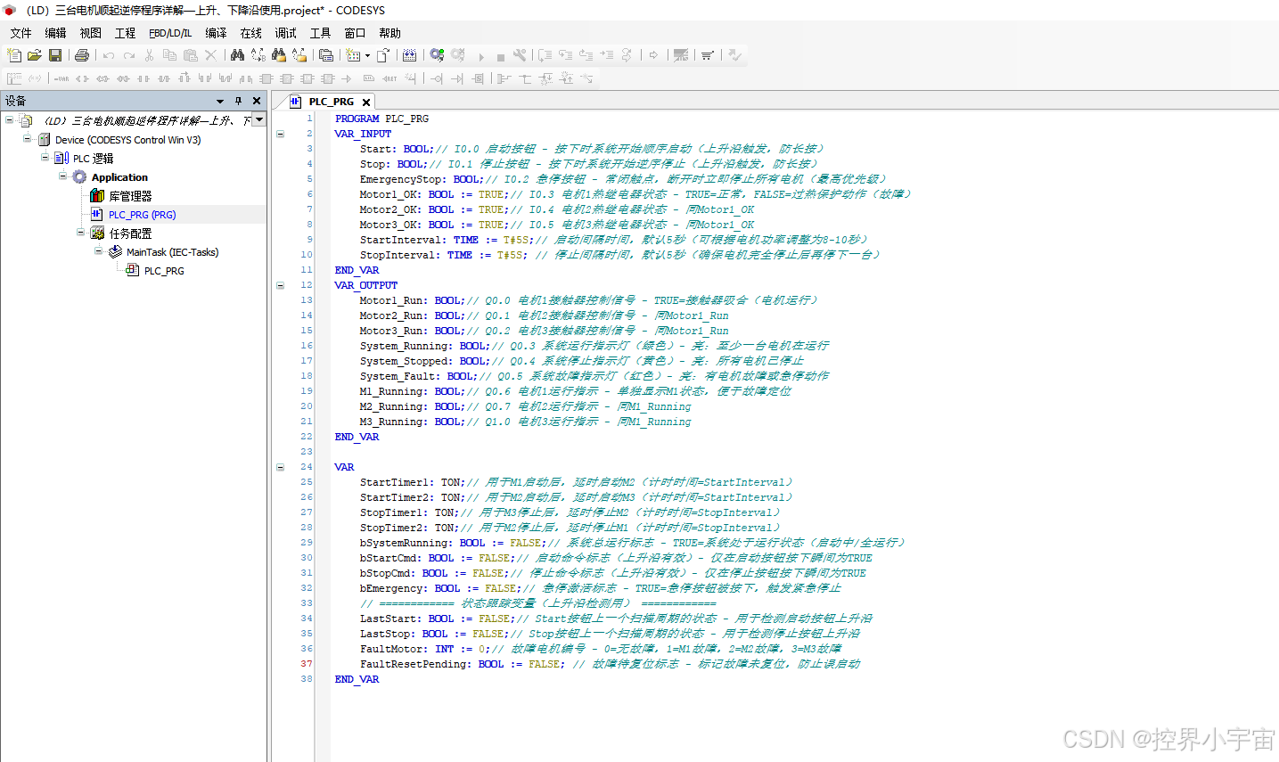 本文将基于CoDeSys平台,详细拆解三台电机顺起逆停程序的设计思路、变量定义、梯形图逻辑(带逐网络注释)、安全特性及调试方法,全程附带详细注释,新手可直接参考学习、复用,快速掌握多电机顺序控制和定时器、标志位的综合应用。
