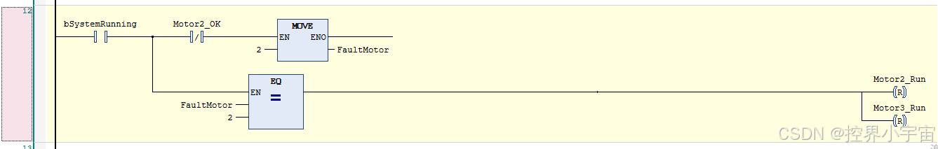 逻辑解析: 当Motor2_OK=FALSE(M2故障),FaultMotor=2(记录故障电机为M2),同时复位Motor2_Run、Motor3_Run(停止M2、M3),M1可继续运行(若M1无故障),减少生产损失。
