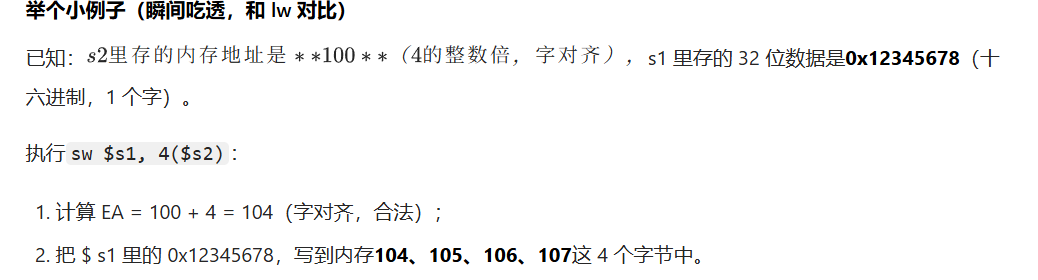 lw t0, 100(s1):把s1寄存器中的数据取出来后往后增加100个字节的位置得到要取出的数据在存储器中的位置,然后把这个位置的数据取出来后送到$这个寄存器中