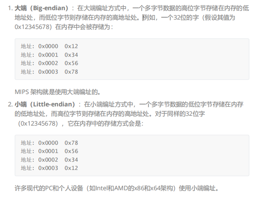 大端(big end) 字节的地址作为字地址;小端 (little end) 字节的地址作为字地址。