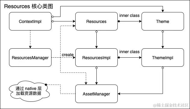 而与 style 相关的资源则是通过 Theme 进行加载,Theme 同样由 Context 上下文类获取,Theme 同时也是 Resources 的内部类,Theme 内部通过 ThemeImpl 进行 style 资源的操作,而 ThemeImpl 是 ResourcesImpl 的内部类,在 ThemeImpl 内引用着 ResourcesImpl 的 mAssets(AssetManager)对象,所以通过 Theme 加载 style 资源时,同样是通过 AssetManager 进行加载,并将加载的数据通过 TypedArray 数组进行返回;