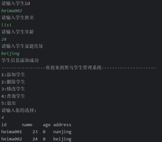 System.out.println(stu.getId() + "\t" + stu.getName() + "\t" + stu.getAge() + "\t" + stu.getAddress() + "\t");