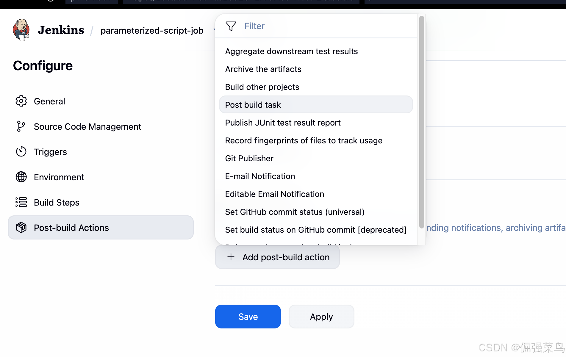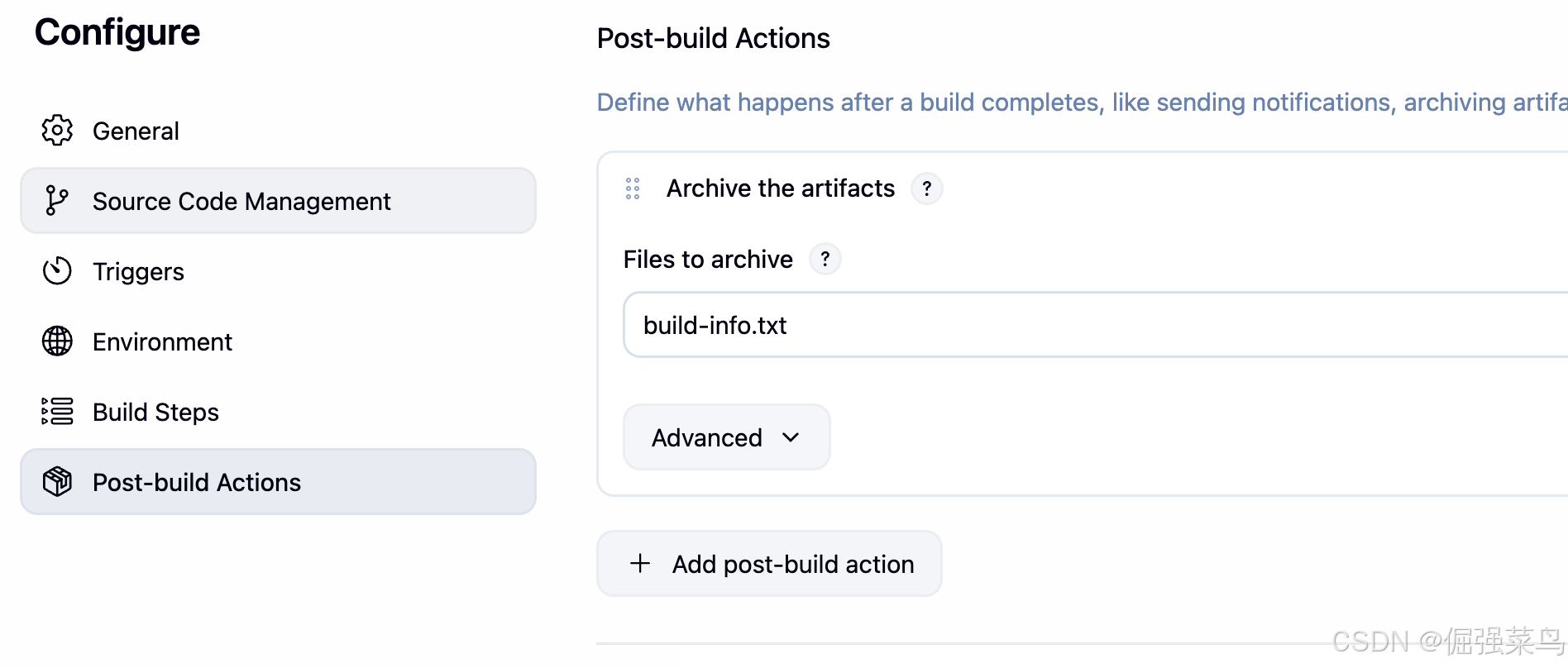 配置一个构建后操作来归档此文件,向下滚动到 Post-build Actions 部分,点击 Add post-build action 下拉菜单,然后选择 Archive the artifacts。