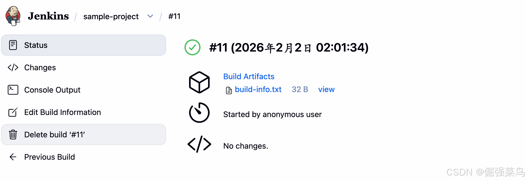 点击 Build Now 来运行一个新的构建。构建完成后,点击 Build History 中的最新构建号。会看到一个名为 Build Artifacts 的部分,其中包含指向 build-info.txt 的链接。可以点击它来查看或下载文件。