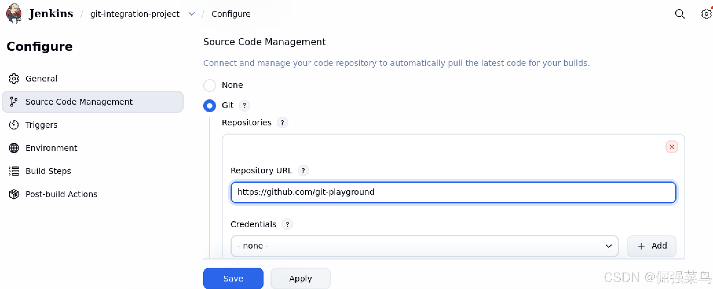 创建一个git-integration-project 项目,配置页找到Source Code Management 部分