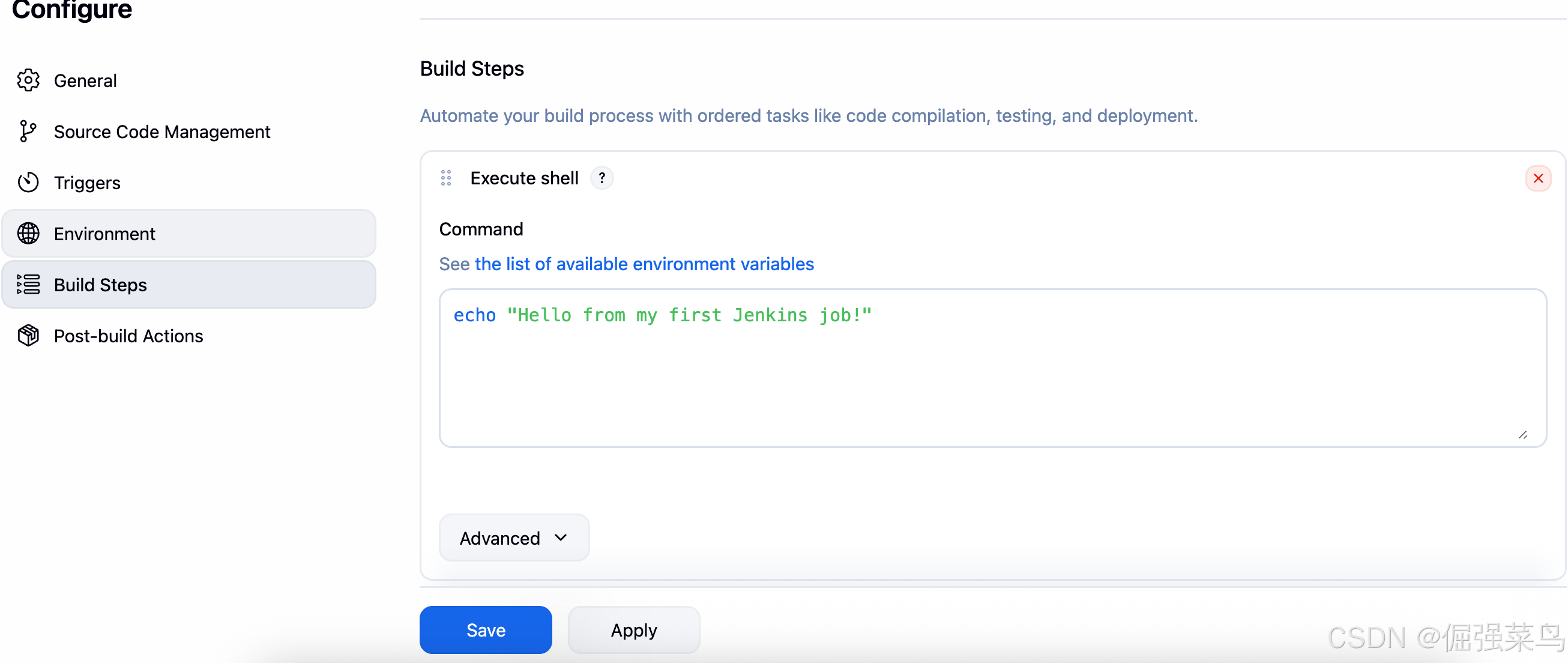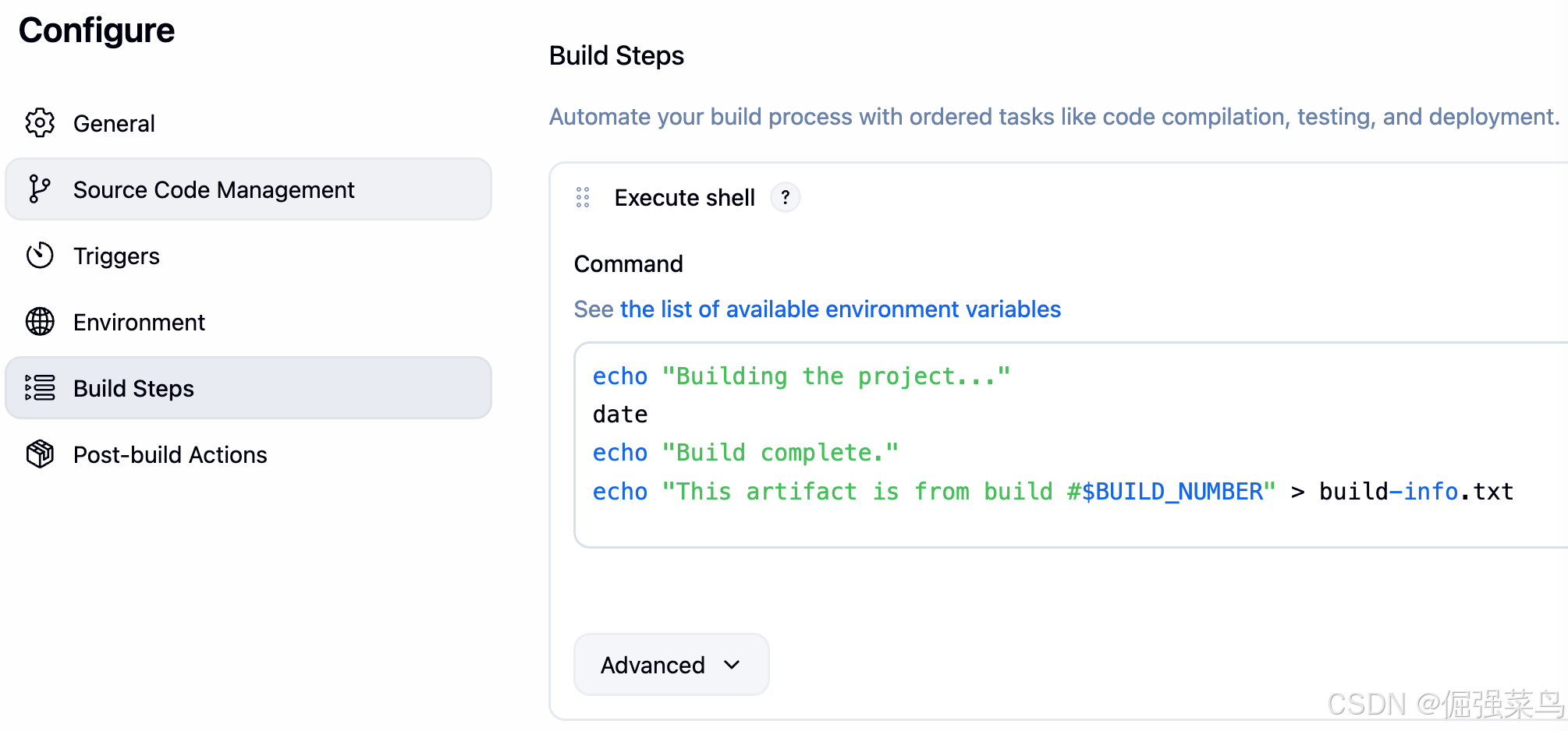 进入配置界面,找到Execute shell 命令框,在脚本中添加新的一行,创建一个名为 build-info.txt 的文件。$BUILD_NUMBER 是 Jenkins 提供的环境变量,其中包含当前的构建号。