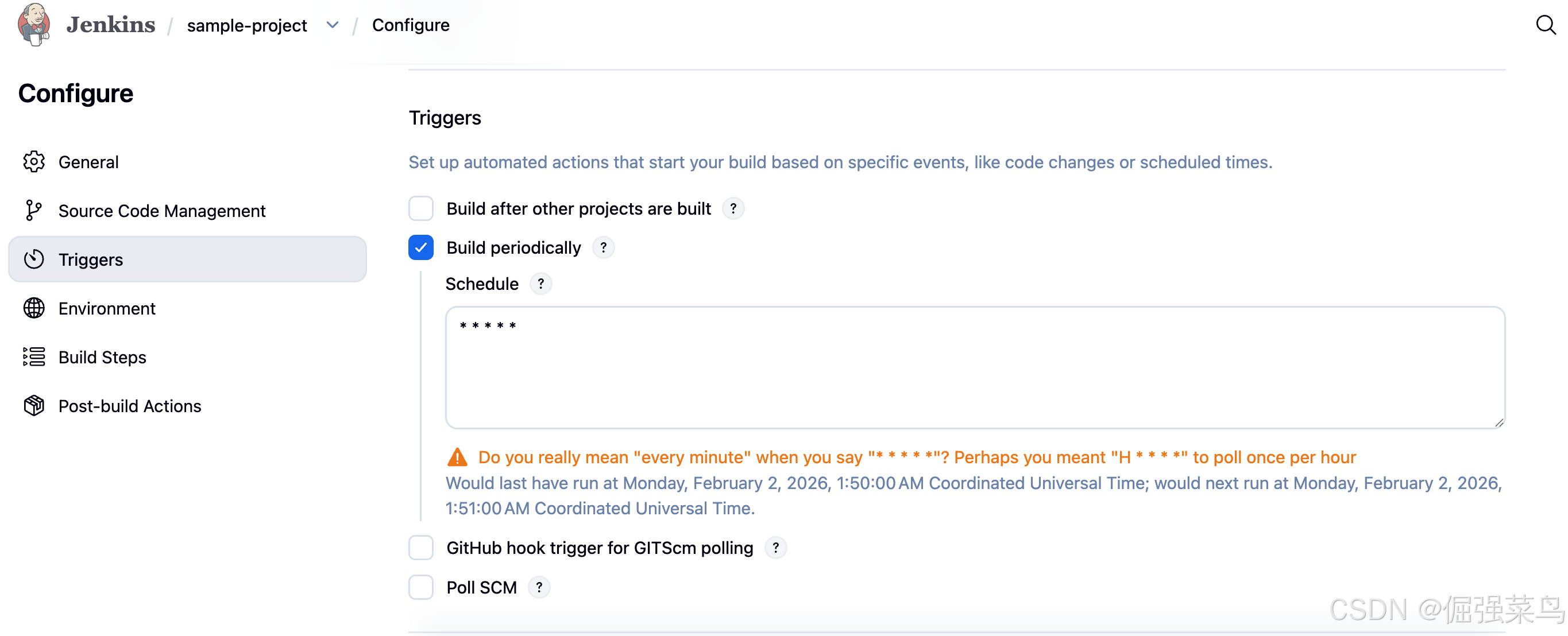 Schedule 文本框使用 cron 语法来定义 Jenkins 检查仓库更改的频率。要每分钟轮询一次,为*****