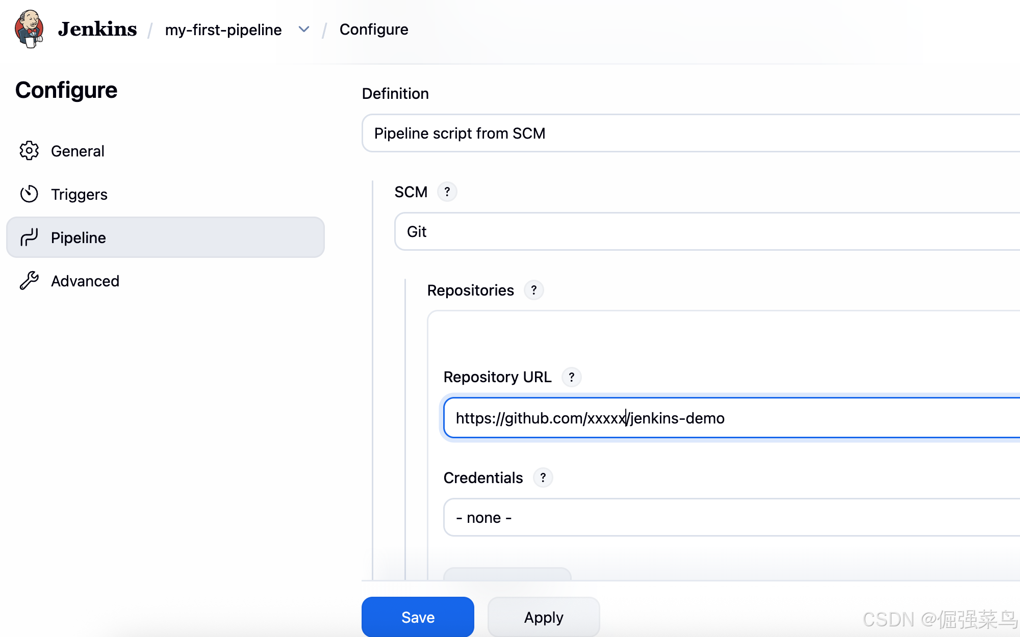 配置你的 Jenkins 项目以从远程 Git 仓库检索其流水线定义。我这里使用一个包含预配置 Jenkinsfile