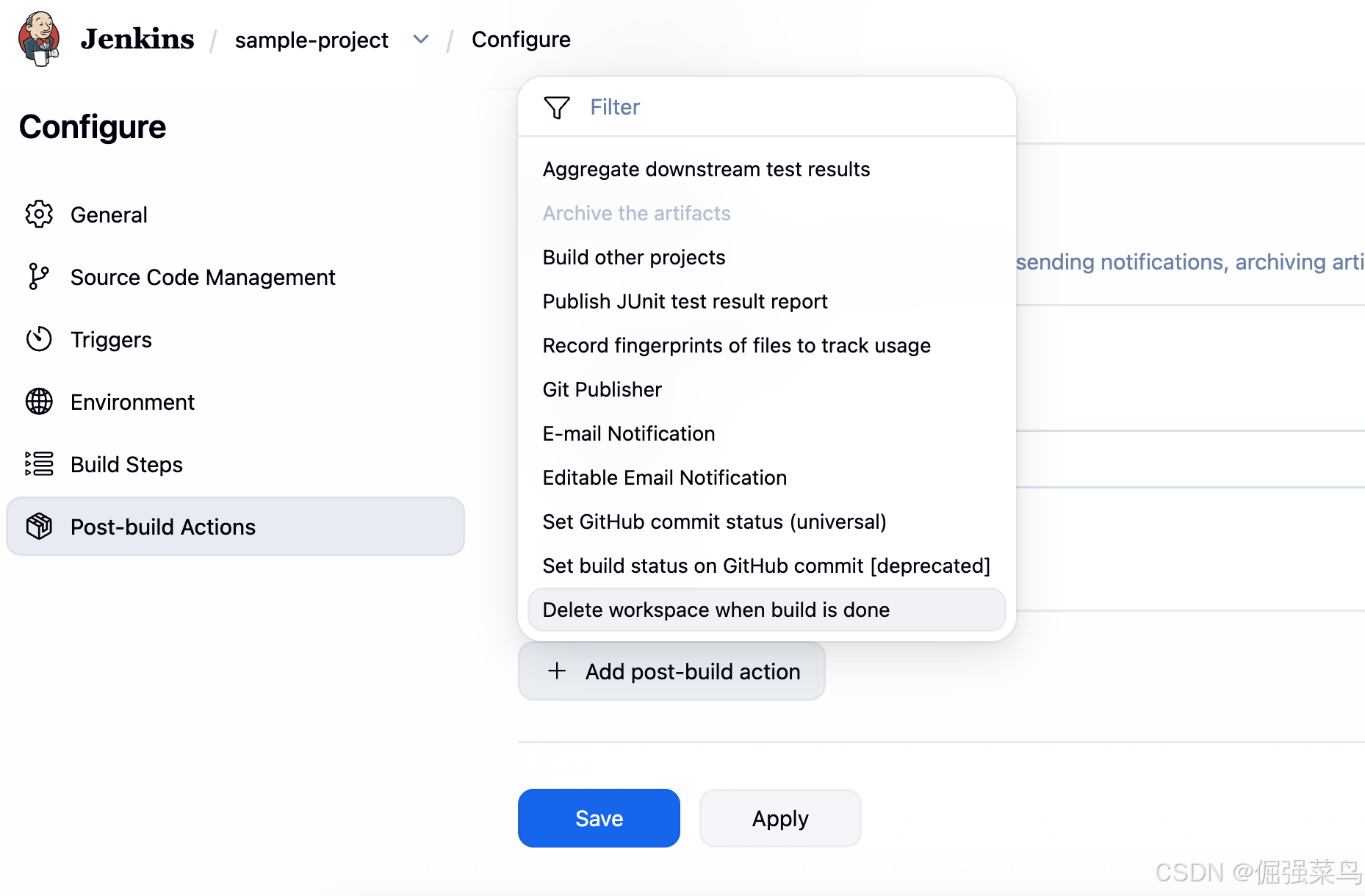 Post-build Actions 部分。点击 Add post-build action 下拉菜单,然后选择 Delete workspace when build is done。