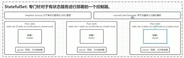 | 稳定的网络标识 | Headless Service,Pod 的 DNS 格式为:{statefulsetName}-{0..N-1}.{serviceName}.{namespace}.svc.cluster.local |
