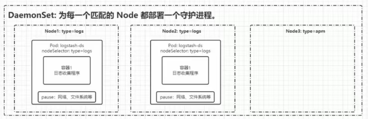 特点:它根据你设定的筛选规则(Selector),自动确保每一个符合条件的节点上都运行着一个守护进程。