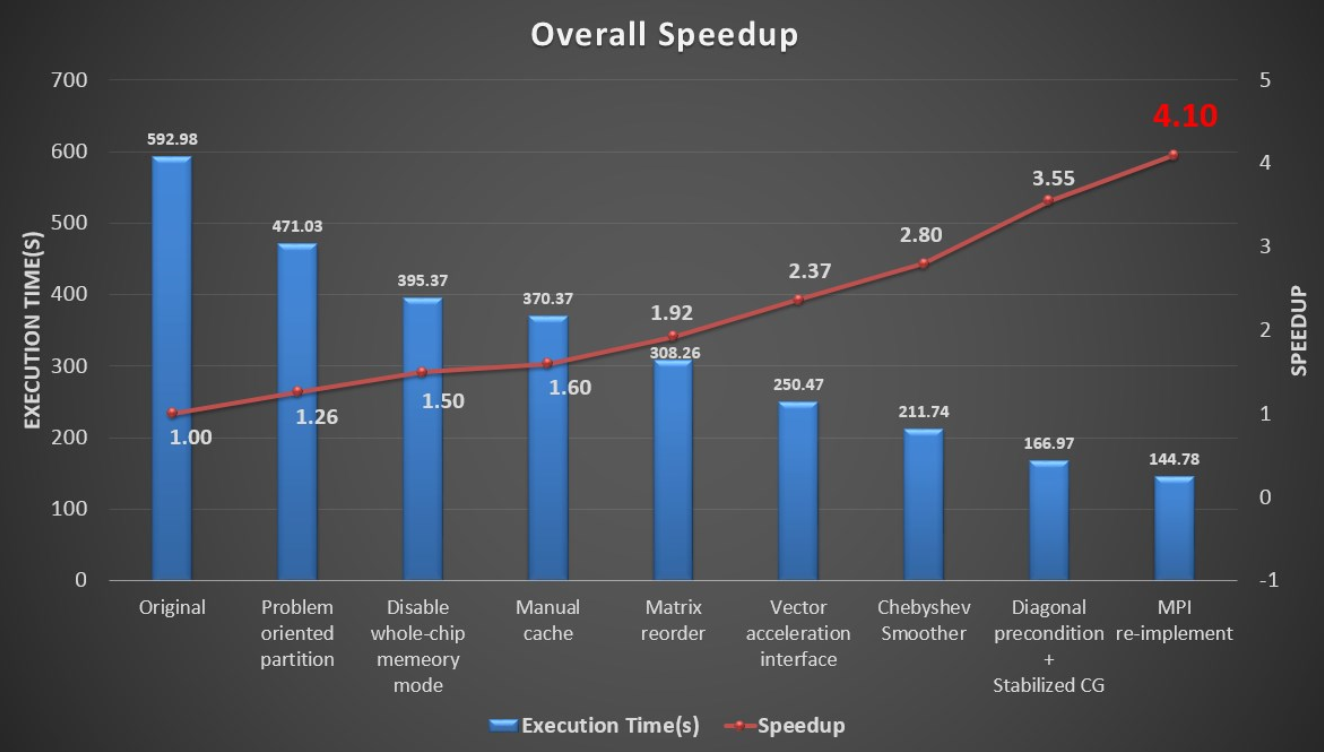 针对申威26010处理器特点,设计统一从核加速接口,对通量计算、稀疏矩阵运算等热点进行众核并行优化,提升数据访存连续性。