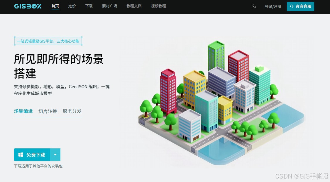 作为轻量化GIS工具箱新秀,GISBox以"高效处理+免费发布"为特色,200M安装包支持Windows/Mac/Linux全系统部署。核心优势在于三维数据处理:支持OSGB等格式与3DTiles的双向转换,提供倾斜摄影实时编辑功能,可快速进行山体抬高下压与地形对齐。内置免费GIS服务器,支持WMTS/WFS/MVT等协议一键发布,成为数字孪生项目数据预处理的首选工具。