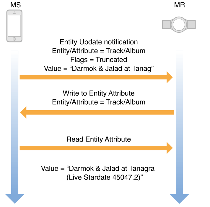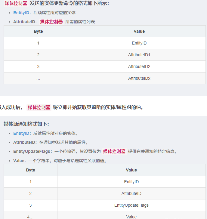 默认情况下,媒体控制器 不会接收有关实体属性的任何信息。所以,为了接收此数据,媒体控制器 首先需要订阅有关实体更新特征的 GATT 通知。然后,媒体控制器 将命令写入实体更新特征,以通知 媒体源 它想知道哪个实体/属性对值。