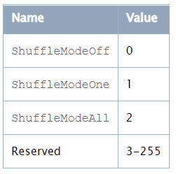 | QueueAttributeIDShuffleMode 队列属性ID:随机播放模式 | 2 | 一个包含随机播放模式整数值的字符串。