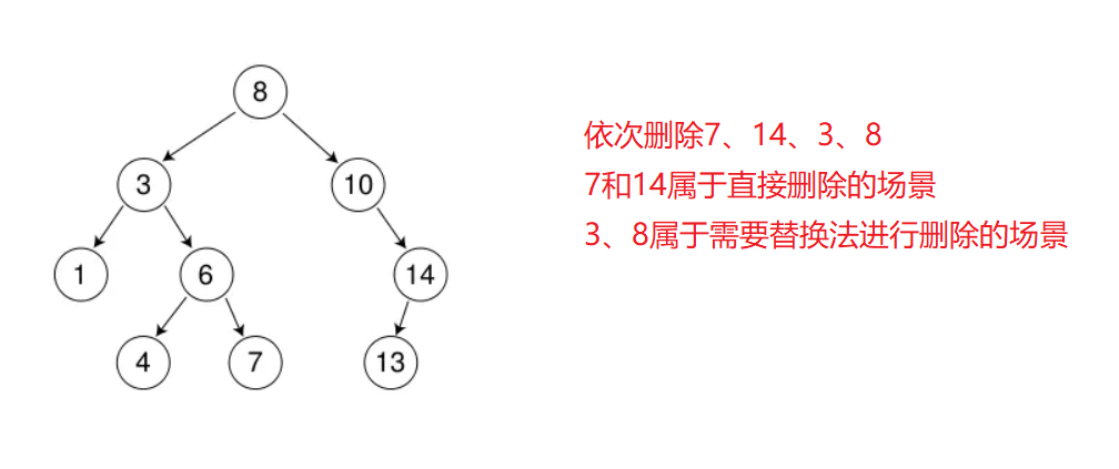 - 要删除的节点有右子树,无左子树:让该节点的父节点指向该节点的右子树,然后删除节点