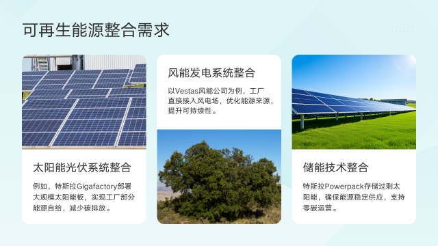 零碳工厂在可再生能源整合方面有诸多需求。首先是太阳能光伏系统整合,以特斯拉Gigafactory为例,其部署大规模太阳能板,实现部分能源自给,这不仅减少了对传统能源的依赖,还显著降低了碳排放,是能源结构转型的有效实践。
