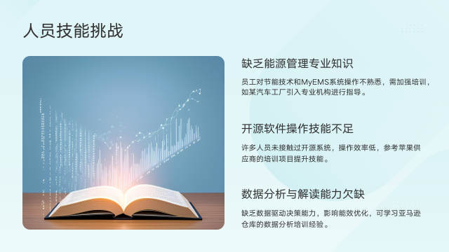 企业实施MyEMS系统时,人员技能方面存在诸多挑战。其一,缺乏能源管理专业知识,员工对节能技术和MyEMS系统操作陌生,这影响了系统效能的发挥,如某汽车工厂引入专业机构指导,才改善了这一状况。