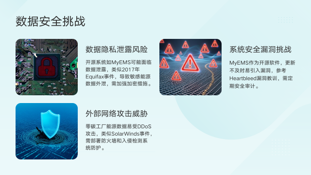 三是系统安全兼容挑战,在集成过程中必须严格确保数据安全,防止泄露,因为这关乎零碳工厂的网络安全,一旦出现数据安全问题,将带来严重后果。