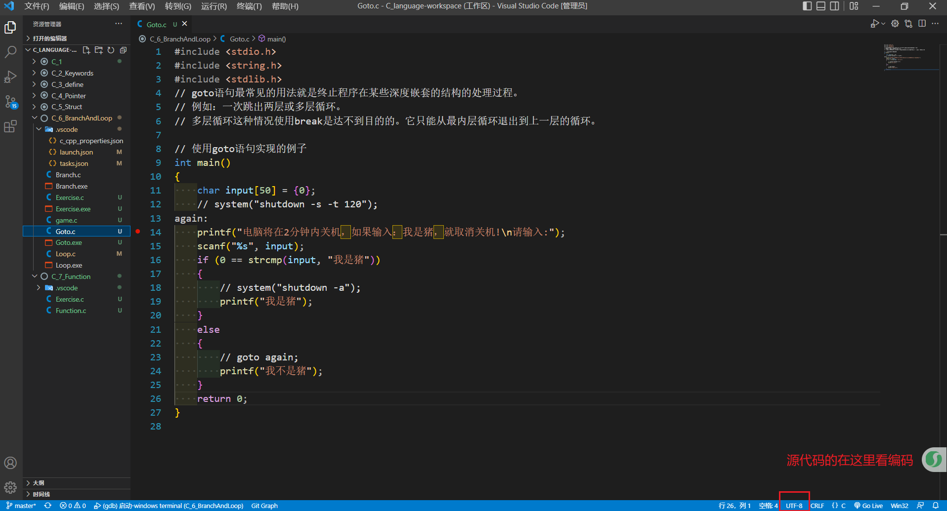 二、本例需要输入中文,但把输入的中文存入数组中发现不是UTF-8编码的导致程序输出不对