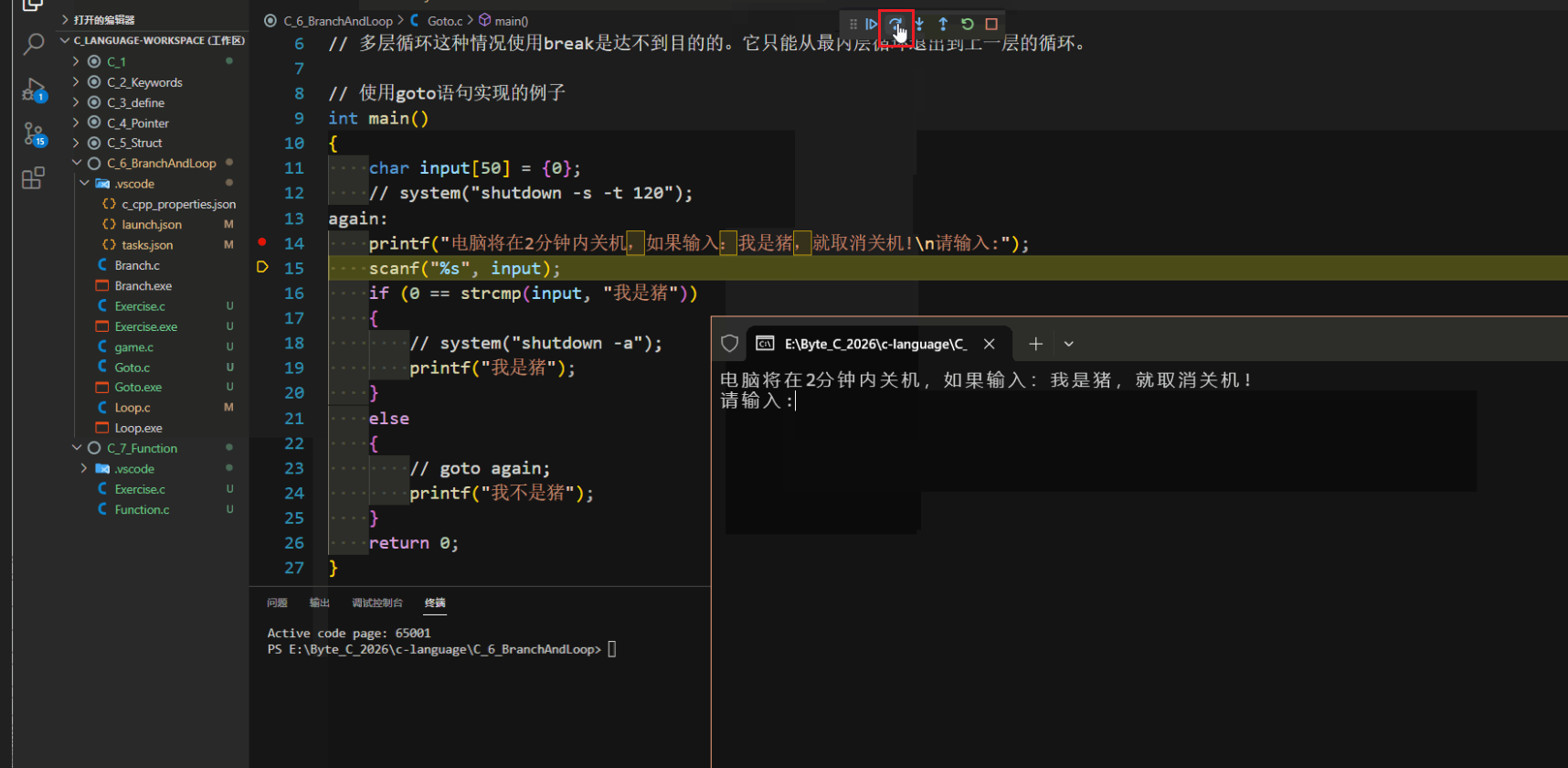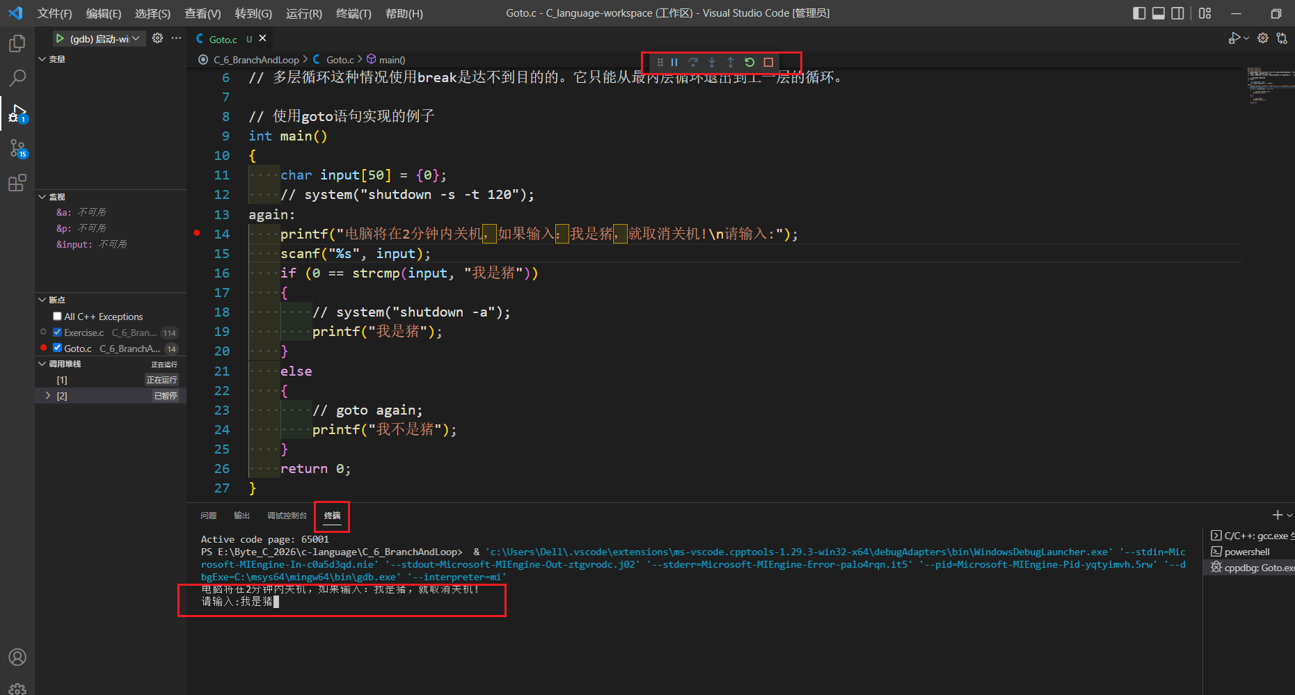再次按下单步跳过,调试会显示暂停,等待用户输入。输入完毕后回车,调试即可继续。