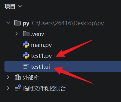 - 返回 PyCharm 项目界面,找到保存好的 .ui 设计文件。