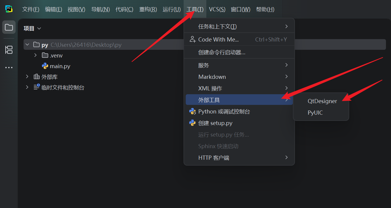 External Tools--->QtDesigner。 - 直接点击 PyCharm 顶部菜单栏
