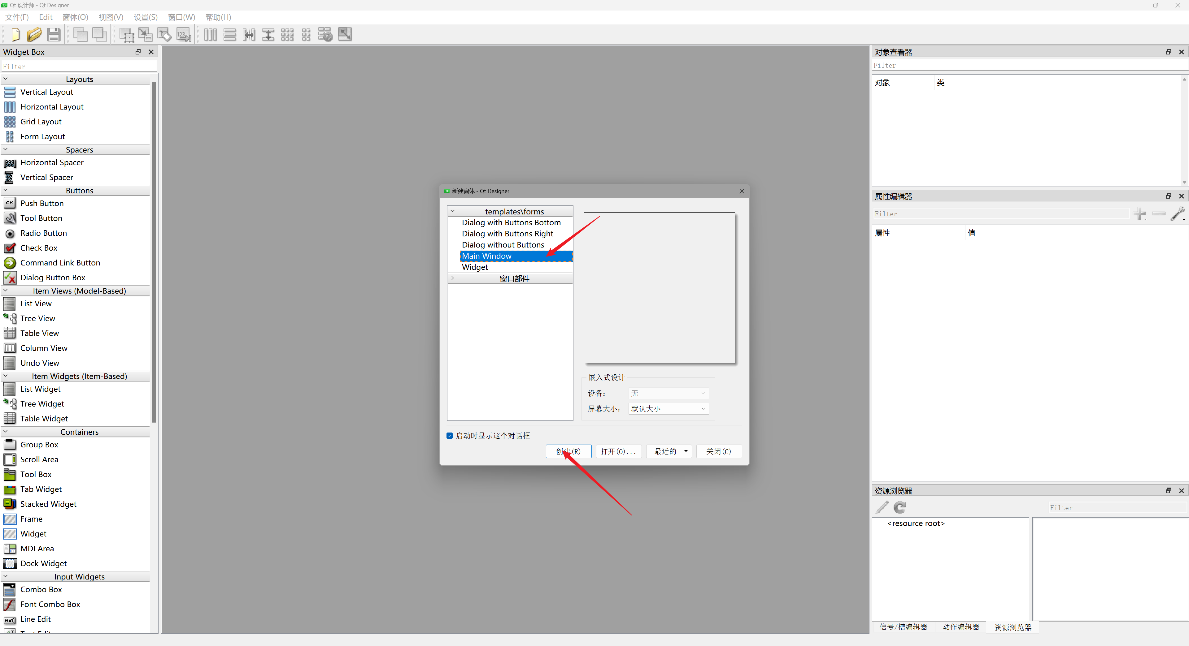 Main Window(主窗口),点击Create(创建)。