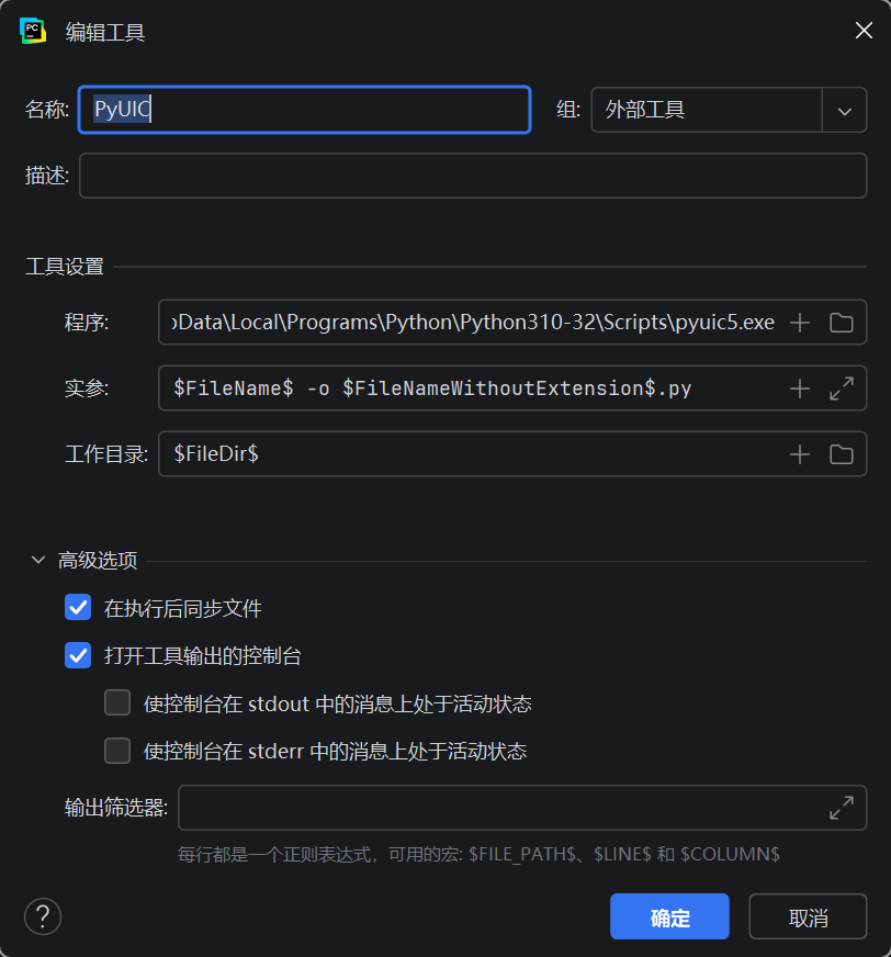 Arguments(参数):$FileName$ -o $FileNameWithoutExtension$.pyWorking directory(工作目录):$FileDir$