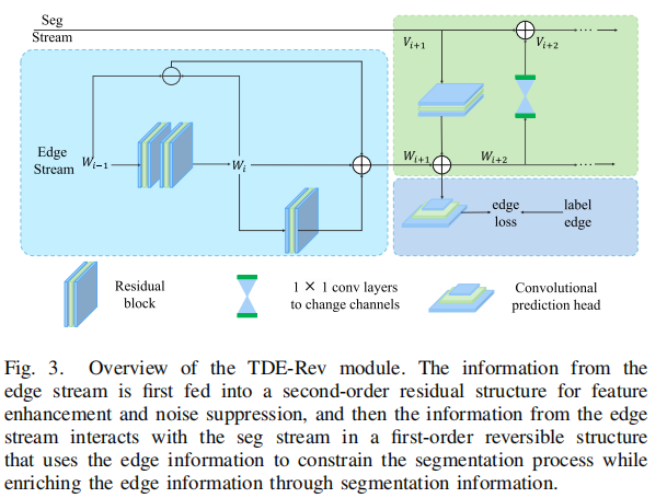 为了进一步精细化目标轮廓并消除边缘混叠,研究团队设计了三阶差分方程引导的可逆结构(TDE-Rev) 。受数值分析中常微分方程(ODE)求解的启发,该模块将边缘提取过程建模为一个高阶差分系统 。通过引入二阶差分项 Δwi=wi−wi−1\Delta w_i = w_i - w_{i-1}Δwi=wi−wi−1 来捕获特征变化的"动量",系统得以在极低对比度的红外背景下,通过高阶导数的敏感性锁定细微的梯度跳变 。同时,利用可逆结构(Reversible Structure)建立起"分割流"与"边缘流"之间的双向高效通道,使边缘细节能够实时约束分割掩码的生成,且无需存储中间激活值,极大地优化了内存效率 。其交互动力学系统可表述为 :