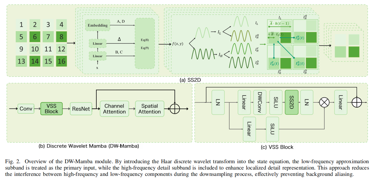 旨在通过频率域的精细分离来抑制背景混叠 。研究团队摒弃了传统的池化或卷积下采样,转而采用二维离散小波变换(2D DWT)将图像分解为低频近似子带 ILI_LIL 与高频细节子带 IHI_HIH 。随后,这些不同频率的分量被深度集成到 Mamba 的状态空间模型(SSM)中,具体集成方式是将 ILI_LIL 作为主输入,将 IHI_HIH 作为状态方程的补充项 。在状态演化过程中,低频分量驱动全局结构的构建,而高频分量则作为状态的实时补偿,确保了微小目标的边缘信息在分辨率降低的过程中依然能够被精确映射 。其核心状态方程描述如下 :