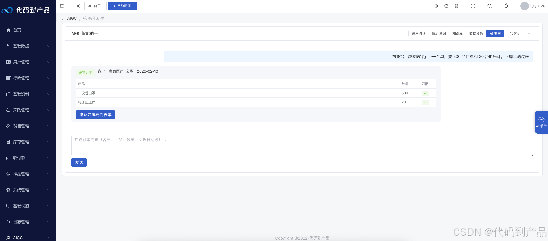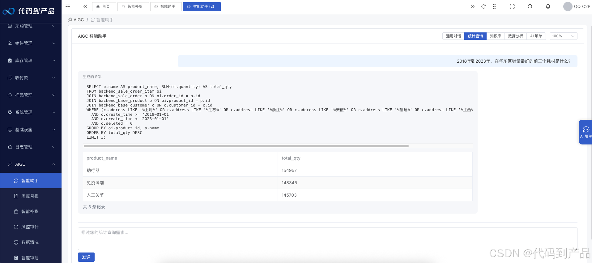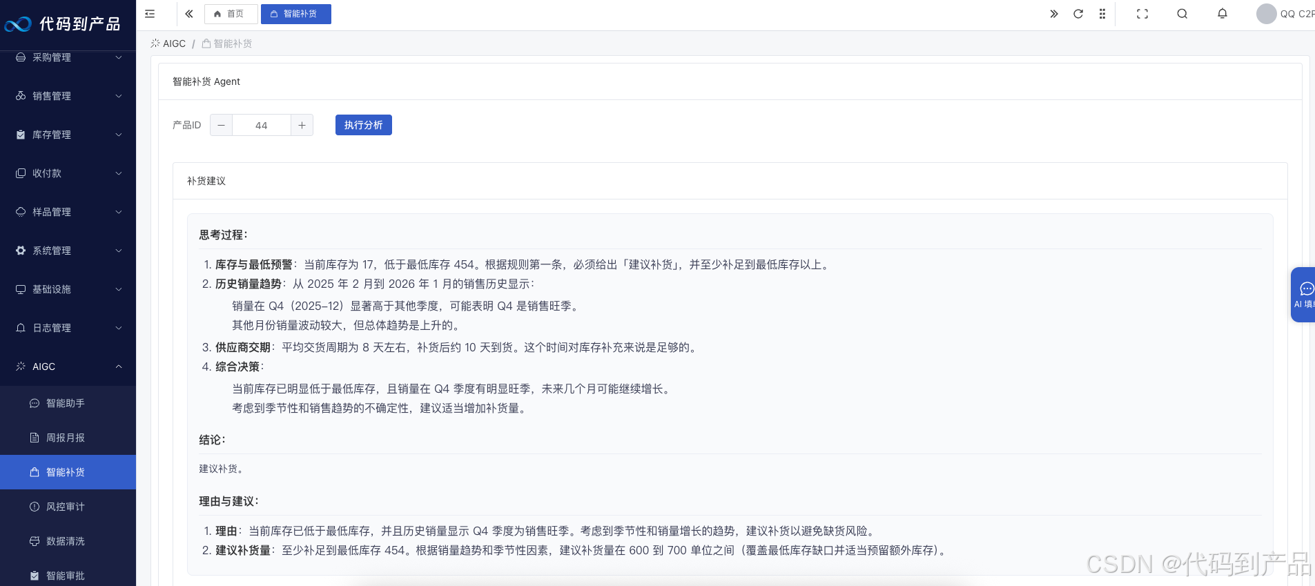 场景:AI 发现库存低于阈值 -> 自动调用查询接口看历史销量 -> 发现下周有大促 -> 自动生成一份补货申请单草稿发送给采购员。