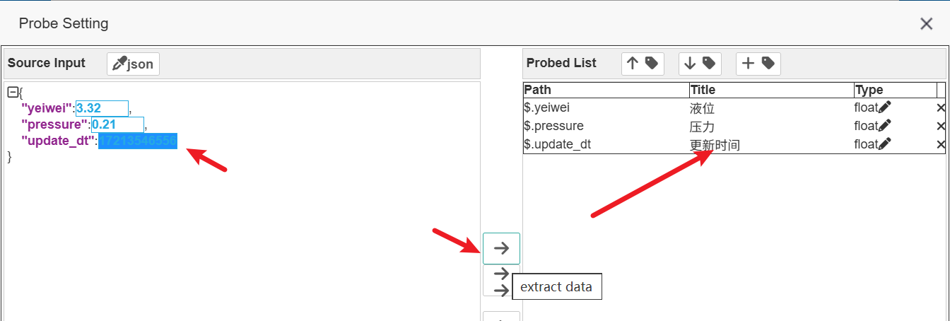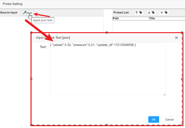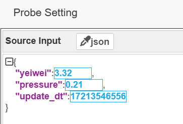 点击"Data Probe"按钮,在弹出的对话框左上角点击"json"按钮,然后把样本JSON数据填写如文本框: