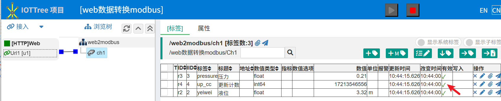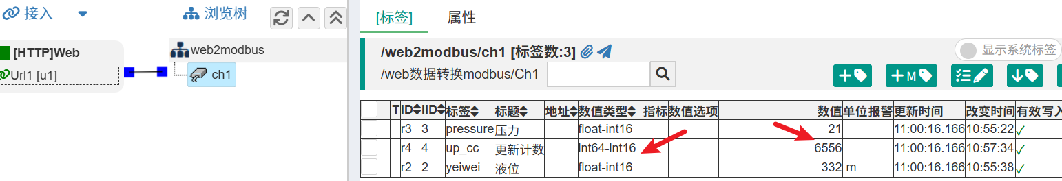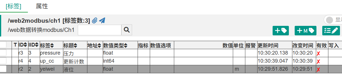 上面只要看到标签数据有效,且更新时间不断刷新,说明标签接入url、提取和绑定数据全部ok了。接着我们需要把这几个标签数据转换为modbus设备的内部寄存器地址中的数据。