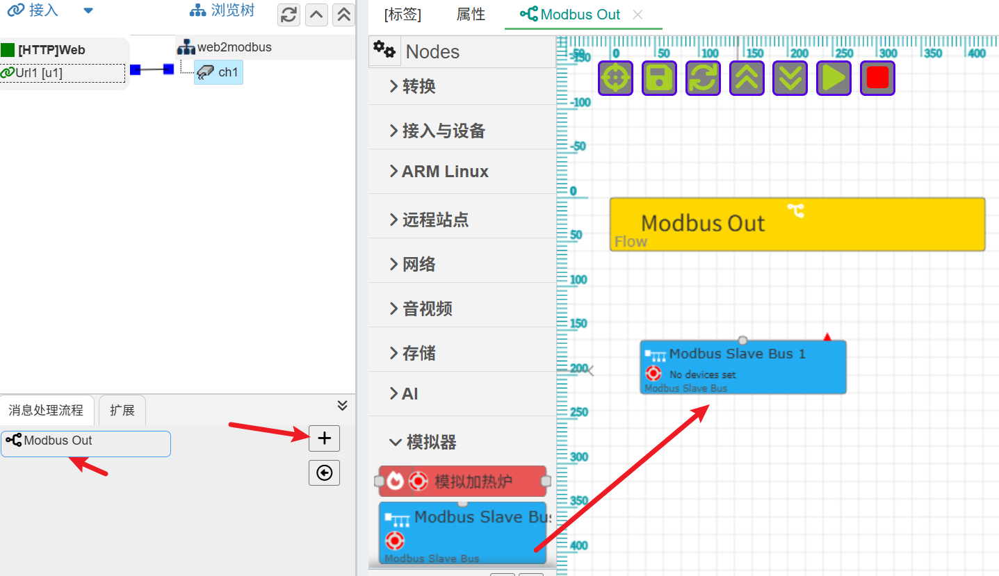 在你的IOT-Tree项目管理界面左下角,你可以添加一个消息流,点击之后,可以看到消息流具体配置界面,你可以在配置界面左边列表选择模拟器分类下的"Modbus Slave"节点,拖拽到配置区就完成了节点的添加。如下图: