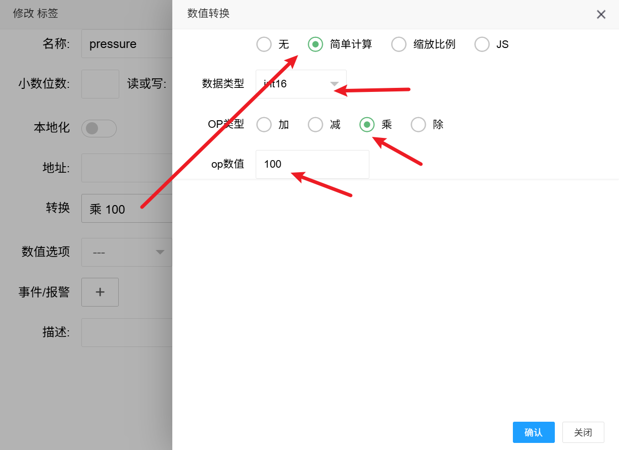 双击压力这个标签,点击"转换"-简单计算,其他一些转换填写内容如下(液位同样转换配置):