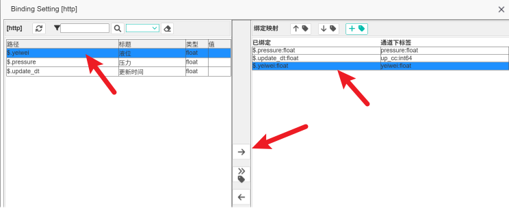 在弹出绑定对话框中,左边选择提取的数据,右边选择通道下面对应的标签,点击中间绑定按钮。多次操作最终完成绑定: